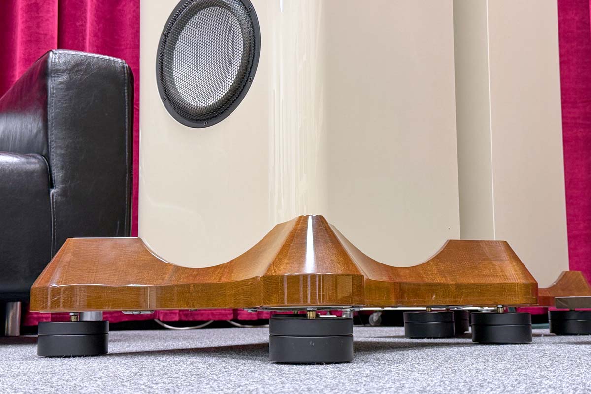 Even the base construction is worthy of attention. Each speaker stands on a solid aluminum plate that is firmly bolted to the cabinet, forming a rigid connection. The foundation is supported by four large cylindrical feet that distribute the high mass effectively. To ensure a living room-friendly appearance, the base is enclosed in a finely-crafted frame made of solid wood panels. In conversation, Alpár Csendes emphasized how important this combination of engineering and traditional craftsmanship is to him. To him, the AV 170s are not mere speakers: they are an expression of a commitment without shortcuts.
