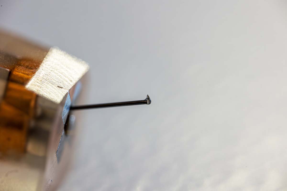 All MC systems are based on boron cantilevers, into which a microscopically fine groove is milled before diamonds of different shapes are glued in, depending on the cartridge class. This is one of the few pre-manufactured components: these tiny needles could never be affixed by hand, so Clearaudio relies on a long-term supplier instead. Next, for further processing, the cantilever is glued into a jig. Lorena Machado threads a coil, then a tiny rubber damper, and finally another coil onto the cantilever. The protruding wires are barely a tenth of a millimeter thick, but still visible to the eye in the bright light of the workbench. Before assembly, the loose ends have been marked with Edding pens in the familiar red/white/blue/green scheme. These will later also be found on the cartridge’s terminals.