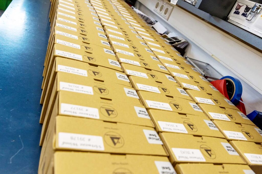 Before the handcrafted cartridge with its distinctive red housing is glued together, further corrections, fine-tuning and the final cleaning of adhesive residues are required. At this point I asked, how many cartridges could be made in this time-consuming process in one shift? And I received an answer that I could have guessed: On good days, it’s five to six MC models, and on bad days, it might be none at all. The entrance area has already filled up with boxes ready for shipping, and the three production employees reveal they have been at it for over a week.