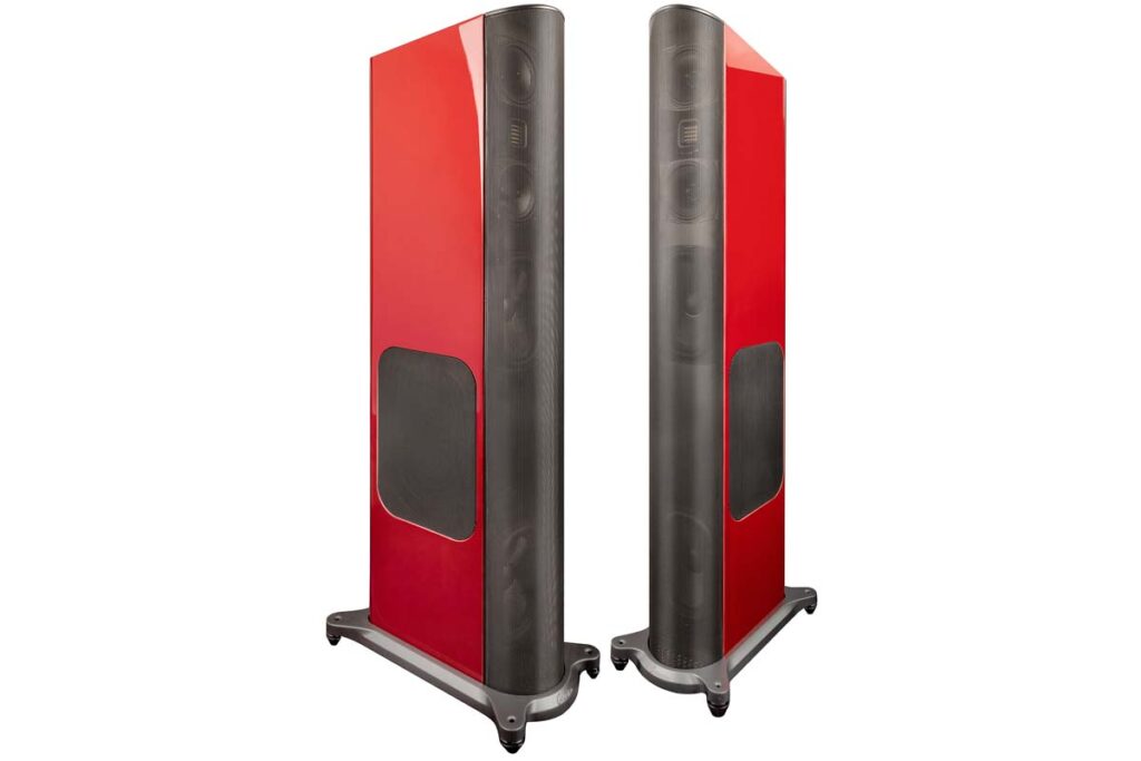Concept: semi-active 3-way loudspeaker with passive radiators | Driver complement: 1 x HVFR (High Velocity Folded Ribbon) tweeter, 2 x 4.5“ midrange cone, 2 x 5/9” woofers, 2 x 6.75/8” passive cone | Subwoofer output: 500 W RMS per channel (1000 W peak) | Inputs: bi-wire speaker terminal, LFE, power connection for subwoofer | Nominal impedance: 4 Ω | Sensitivity: 91 dB | Frequency response: 29 Hz to 25 kHz | Recommended amplifier power: 20 to 500 W per channel | Dimensions (W/H/D): 19/124/37.5 cm (height on stand without spikes), stand 30/43 cm (W/D) | Weight: 27.2 kg | Warranty period: 2 years | Pair price: around € 7000; Santa Barbara Red version € 7300