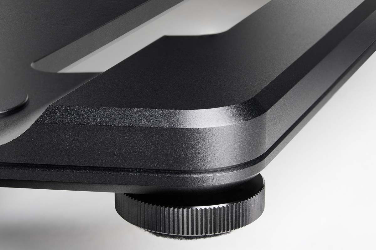 I could kick things off with a rant on how speaker manufacturers supposedly fail to grasp that a loudspeaker is always also a piece of furniture, and therefore show no sense for living-room compatibility or “wife acceptance factor.” This adage is often invoked, but rarely true in my experience. It’s been quite a while since I last encountered a speaker that had to compensate for questionable looks with angelic sound. We currently have four pairs in our listening room, all elegantly proportioned with excellent finishes – none of them would be even remotely embarrassing in front of guests. The Inklang Ceterra 70R Black Edition, however, plays in a different league altogether. Even though, for acoustic reasons, it’s essentially a tall rectangular box just like any other speaker, the Hamburg-based designers have somehow managed to make it look anything but: the slanted baffle may not be unique, but it adds a certain visual lightness; the radius with which it transitions into the top, along with the wood inlay on the back that makes the cabinet appear like two interlocking half-shells, further contributes to giving the Ceterra an almost organic shape. It may be finished in anthracite, but it’s anything but understated – with its wooden phase plugs and futuristic base, it practically shouts: “Look at me – I’m a designer piece down to the last detail!”