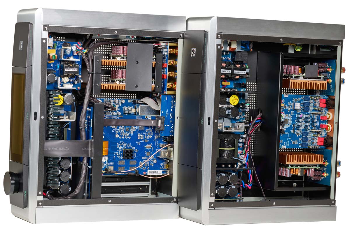 Besides the permanently implemented high-bit DAC with ESS Sabre chips directly behind the inputs, there are two slots that can accommodate expansion modules. Finally, a whopping 260 watts at eight ohms provide enough power in all situations.