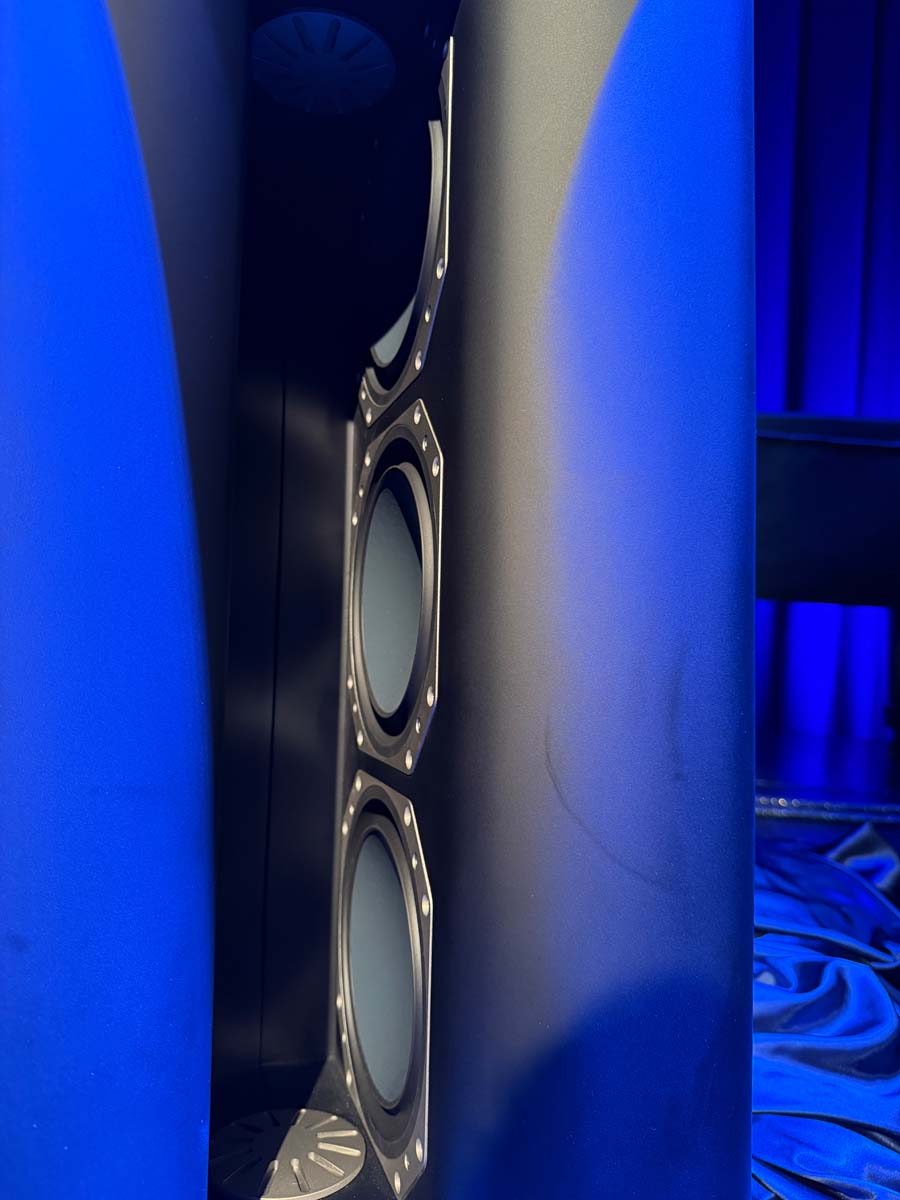 The M8 doesn’t feel like a cabinet so much as a structure: three modules stacked into an acoustic sculpture. At the center sits the midrange/treble system, with two bass modules working above and below it. The construct as a whole comes in at a whopping 325 kg (717 lbs) per speaker, but excessive mass isn’t the point – the idea behind it is maximizing surface area to minimize excitement and therefore energy storage, ultimately achieving maximum control.