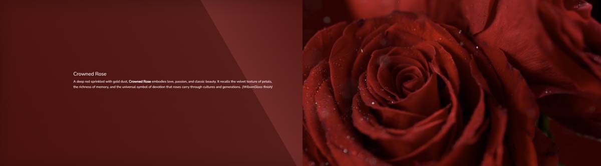 Crowned Rose – Described as a deep red infused with gold dust, this WilsonGloss finish is said to evoke “love, passion, and classic beauty.” The company likens it to the velvet texture of rose petals and the cultural symbolism of devotion associated with the flower.